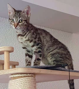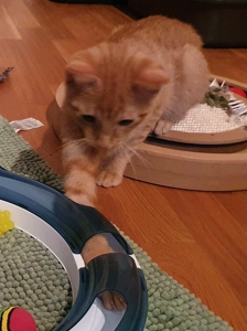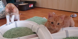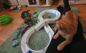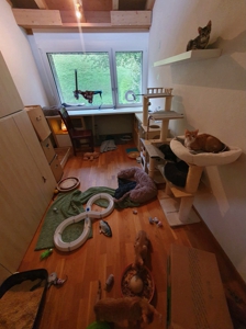 Ja, und dann trauten wir uns gaaaaanz langsam immer näher an den Menschen 🙀. Nicht nur Leckerlis lockten uns, auch Spielangeln und Kugelbahnen. Yoda liess es sogar zu gestreichelt und angefasst zu werden. Aslan und Keano sind da auch schon mutig, sie können einfach nicht widerstehen und jagen die Spielangel. Aslan hat dabei entdeckt, dass die Menschenbeine cool sind und man dort auch ein wenig “kuscheln” kann 😍.