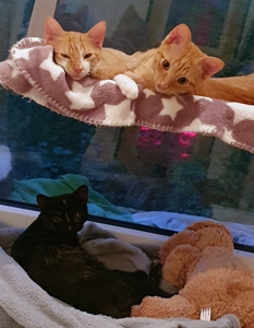 Vor kurzem mussten wir alle wieder zum Tierarzt, unser Pflegemami hat uns da ganz schön überlistet mit den Boxen. Warum wir dort hin mussten, leuchtet uns noch immer nicht ein. Uns geht’s doch wieder gut und wir futtern doch 🤔? Gottseidank war es dann doch nicht so schlimm wie die anderen Male. Wir wurden nur schnell angeschaut durch die Gittertürchen, ganz kurz festgehalten und bekamen einen Picks. Nur Aslan ergriff plötzlich die Flucht nach vorne, hat unserem Pflegemami noch ein Denkmal gesetzt 😲, bevor er dann wieder überlistet wurde und in die Box zurückkam. Was für eine Aufregung nur wegen einem Picks. Wir waren danach natürlich kurz sauer, aber die Spielangel und Leckerlis überzeugten uns dann doch wieder vom Menschen.