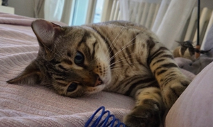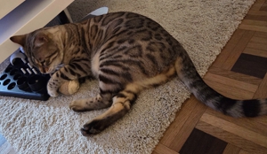 Sie spielt nach wie vor unglaublich viel und gerne. Allein wird so lange gespielt, bis jeweils alle Spielsachen unter der Kommode nicht mehr zugänglich sind. Spiralen sind noch immer hoch im Kurs. Aber auch mit Frauchen wird gerne gespielt, mit Spielangeln am liebsten mit Federn dran! Es ist sehr unterhaltsam, wenn Mia etwas anpirscht und vor dem Speedstart noch kurz mit dem Füdli wiggelt 😂.