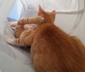 Es ist langsam eng im kleinen Bad… aber im anderen Katzenzimmer sind eben noch zwei Kätzchen hier, die auf ihr Für-immer-Zuhause warten. Wegen dieses blöden Pilzes können wir leider nicht zu ihnen. Aber wir sind zufrieden. Wir kriegen öfters Besuch von der Pflegefamilie, die sich auch Zeit nimmt für uns. Und, da wir stärker und grösser sind, bleibt das vernetzte Fenster ganz offen während Nathalie putzt. So lassen wir sie in Ruhe putzen, und können dem spannende Leben im Hof zuschauen 😃.