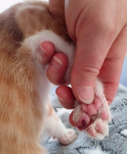 Wir sind noch etwas fragil. Immer wieder ist was… Jetzt ist die Verdauung in Ordnung. Diese Woche hatte ich aus heiterem Himmel eine geschwollene Pfote… Beim genauer hinschauen, war die Zehe dick, blau und hatte Krusten 🙀. Als Nathalie diese Krusten wegnehmen wollte, kam Eiter raus… also ab zum Tierarzt. Ich war mega lieb, habe die ganze Zeit geschnurrt, obwohl das Ganze 2 Std. (!) dauerte. Erstens mussten wir, trotz Termin, lange warten, dann ging die Prozedur recht lange und war für mich ziemlich schmerzhaft. Ich habe an 3 Pfoten kleine Wunden, zum Glück ist nur eine entzündet. Woher ist nicht klar, denn im kleinen Bad ist nichts, dass schneidet. Evtl. das Gitter am Fenster? Wir dürfen da nicht hochklettern, aber es ist viel zu lustig, dass wir uns daranhalten 🤭. Ab sofort wird nur unter strenger Aufsicht gelüftet, und Nathalie steht daneben. Fertig mit hochklettern. Sie hat das Gitter komplett untersucht und nichts gefunden. Aber trotzdem. Die Einstreu wurde angepasst, jetzt haben wir Pellets, damit weniger an meiner Pfote klebt, bis es geheilt ist. Zurück zu meiner Behandlung. Ich bekomme jetzt Antibiotika, und muss täglich die Pfote baden. Das finde ich nicht lustig, eine Minute ist recht lange und daher ist es eine nasse Angelegenheit, vor allem für Nathalie 😅. Aber es kommt gut, meine Pfote sieht schon viel besser aus.