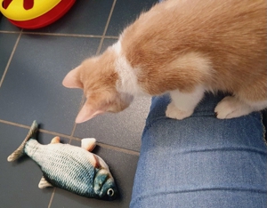 Leider ist der Hautpilz noch nicht besiegt und die Kultur war nach 10 Tage doch noch positiv… sie muss 14 Tage negativ sein, damit es als besiegt gilt 😕. Somit gehen die Putzerei, Desinfiziererei, das Baden 2 x wöchentlich und die Medikamenten-Einnahme weiter. Wir hatten so Hoffnung… und leider nix. Wir werden in 2 Wochen wieder getestet, was wiederum 14 Tage dauert. Einziger Lichtblick: ab Samstag, wenn alles gut geht, dürfen wir endlich in ein grosses Zimmer umziehen. Das ist zwar für die Pflegefamilie mühsamer zum täglich Putzen und speziell gegen Pilz behandeln, aber für uns 4 natürlich top 🤗! Nach dem Baden dürfen wir uns nicht lecken, weil es ungesund ist. Erst wenn es trocken ist, ist es ok. Damit wir dies nicht tun, bekommen wir meistens eine neue Beschäftigung, die uns in dieser Zeit möglichst ablenkt. Der Fisch auf dem Video, war genau deswegen gedacht 😉. Anfänglich hatte wir alle 4 Riesenrespekt davor. Am längsten Cannelle, sie hat sicher einer Stunde gebraucht, um ihn doch zu berühren.