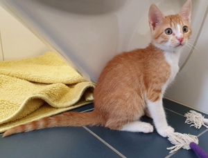 Leider ist der Hautpilz noch nicht besiegt und die Kultur war nach 10 Tage doch noch positiv… sie muss 14 Tage negativ sein, damit es als besiegt gilt 😕. Somit gehen die Putzerei, Desinfiziererei, das Baden 2 x wöchentlich und die Medikamenten-Einnahme weiter. Wir hatten so Hoffnung… und leider nix. Wir werden in 2 Wochen wieder getestet, was wiederum 14 Tage dauert. Einziger Lichtblick: ab Samstag, wenn alles gut geht, dürfen wir endlich in ein grosses Zimmer umziehen. Das ist zwar für die Pflegefamilie mühsamer zum täglich Putzen und speziell gegen Pilz behandeln, aber für uns 4 natürlich top 🤗! Nach dem Baden dürfen wir uns nicht lecken, weil es ungesund ist. Erst wenn es trocken ist, ist es ok. Damit wir dies nicht tun, bekommen wir meistens eine neue Beschäftigung, die uns in dieser Zeit möglichst ablenkt. Der Fisch auf dem Video, war genau deswegen gedacht 😉. Anfänglich hatte wir alle 4 Riesenrespekt davor. Am längsten Cannelle, sie hat sicher einer Stunde gebraucht, um ihn doch zu berühren.