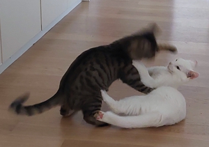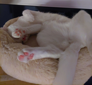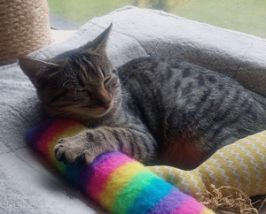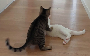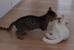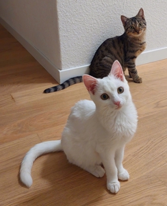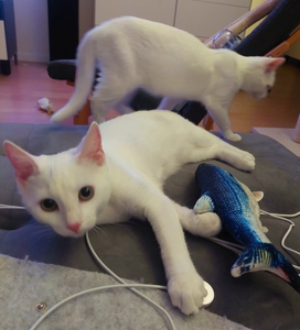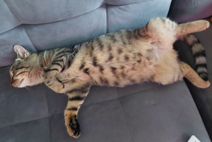 Nisha entscheidet selbst, ob sie gerade Lust auf Nähe hat. Aber wenn sie sich dafür entscheidet, dann wirklich von Herzen 😍. Sie kommt schnurrend an, macht hingebungsvoll Biscuits und schläft dann oft direkt auf dem Bauch ein. Beim Spielen zeigt sie jedoch ihr wahres Talent: Sie ist eindeutig die Jägerin des Trios. Sobald die Spielangel rausgeholt wird, verwandelt sie sich in eine Mini-Raubkatze 😃. Hat sie die Beute erwischt, wird geknurrt, gefaucht und sehr deutlich klargestellt, dass Teilen keine Option ist. Anschliessend trägt sie ihre “Beute” stolz durch die Wohnung, als hätte sie gerade ein Grosswild erlegt.