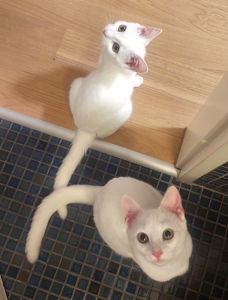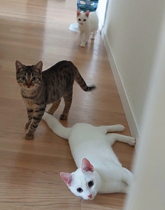 Was Besuch angeht, haben die drei ein erstaunlich professionelles Auftreten entwickelt. Sobald jemand zur Tür hereinkommt, stehen sie bereit. Jeder wird gründlich inspiziert, sofort begrüsst und, wenn man Glück hat, auch direkt als potentielle neue Lieblingsperson eingestuft 😻. Schüchternheit ist hier absolut kein Thema. Menschen sind grundsätzlich toll, und Streicheleinheiten werden ohne weitere Prüfung akzeptiert. Beim Essen sind sie ähnlich unkompliziert Und wenn etwas runterfällt, ist es per Definition ihr Snack.