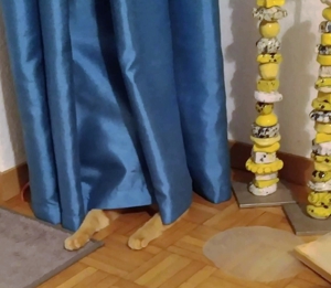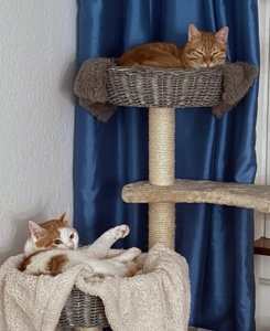 Die beiden Angestellten, Beatrice und Christoph, begreifen immer besser, was wir gerne haben und was nicht. Zum Beispiel haben sie vor drei Wochen endlich dieses blöde Gitter entfernt 😉, wir können die ganze Wohnung benutzen und haben schon viele kuschelige Plätzchen zum Ausruhen gefunden, im Vorratsregal, im Wandschrank, auf dem Bett, auf dem Sofa, und natürlich auch in den vielen Katzenkissen. Tagsüber schlafe ich im Wandschrank dort habe ich Ruhe , Mato hält die Angestellten auf Trab 😅, er verlangt immer wieder zu spielen.