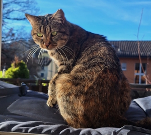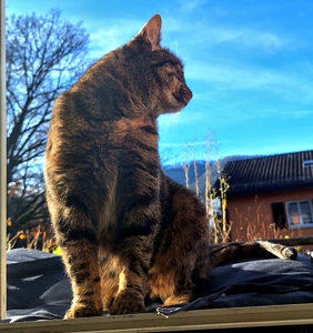 Dann Überraschung! am nächsten Abend sass Madame Nachbarskatze wieder vor unserer Tür. Offenbar wollte sie überprüfen, ob ich immer noch hier wohne. Und wisst ihr was? Ich fand das gar nicht weiter merkwürdig. Aber die Kittensitter? Die trauten dem Ganzen nicht und machten die Tür zu. Frechheit! Da will man einmal eine soziale Katze sein, und schon wird man weggesperrt. Menschen… 🤔. Zum Glück gab es am Wochenende eine Wiedergutmachung. Obwohl es draussen gerade eisig ist und ich freiwillig keinen Pfotenabdruck auf dem Balkon hinterlassen würde, kam die Sonne heraus. Und die Kittensitter, klüger als gedacht, legten ein Kissen draussen bereit, hoben mich hoch und setzten mich in die Sonne 🙂. Anfangs war ich verwirrt. Muss ich jetzt wieder draussen leben? Aber dann spürte ich die warmen Strahlen auf meinem Fell und wusste: Ich wurde in ein königliches Spa getragen. Ich habe geschnurrt wie ein Motorboot und ich hatte ein dickes Grinsen auf meinem Gesicht wie ihr auf den Fotos sehen könnt.