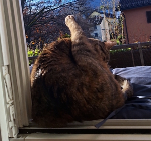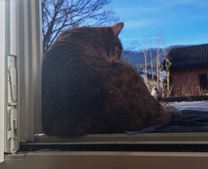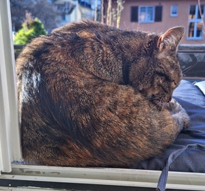 Dann Überraschung! am nächsten Abend sass Madame Nachbarskatze wieder vor unserer Tür. Offenbar wollte sie überprüfen, ob ich immer noch hier wohne. Und wisst ihr was? Ich fand das gar nicht weiter merkwürdig. Aber die Kittensitter? Die trauten dem Ganzen nicht und machten die Tür zu. Frechheit! Da will man einmal eine soziale Katze sein, und schon wird man weggesperrt. Menschen… 🤔. Zum Glück gab es am Wochenende eine Wiedergutmachung. Obwohl es draussen gerade eisig ist und ich freiwillig keinen Pfotenabdruck auf dem Balkon hinterlassen würde, kam die Sonne heraus. Und die Kittensitter, klüger als gedacht, legten ein Kissen draussen bereit, hoben mich hoch und setzten mich in die Sonne 🙂. Anfangs war ich verwirrt. Muss ich jetzt wieder draussen leben? Aber dann spürte ich die warmen Strahlen auf meinem Fell und wusste: Ich wurde in ein königliches Spa getragen. Ich habe geschnurrt wie ein Motorboot und ich hatte ein dickes Grinsen auf meinem Gesicht wie ihr auf den Fotos sehen könnt.