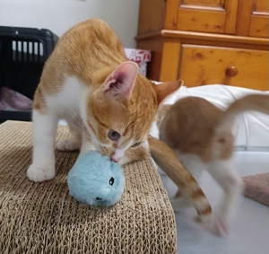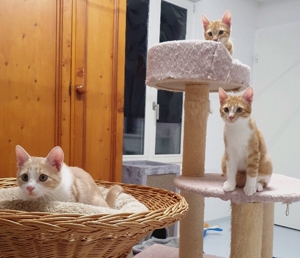Wir mussten ein paar Sachen lernen, zum Beispiel, dass wir nicht raus dürfen aus unserem Zimmer… was uns sehr schwer fällt 😅. Wir schlafen extra direkt vor der Türe, damit wir es raus schaffen, wenn jemanden kommt 😉. Nur Karenji ist brav, wartet schön auf dem Fenstersims und beobachtet, wie wir anderen so rausflitzen und Nathalie uns hinterher springt. Am interessiertesten ist Möhrchen, die haut regelrecht direkt ab, sobald die Türe auf geht. Aber Nathalie hat alles im Griff und packt uns ganz schnell wieder zusammen und zack, zurück ins Zimmer 😕. Auch muss Karenji lernen, dass sie im Lavabo nichts zu suchen hat… das will sie nicht verstehen und springt immer wieder rauf. Sonst sind wir superbrav, wir demolieren nichts, ausser Karton, der uns zur Verfügung steht. Daran zahnen wir, wenn unsere Zähne wehtun. Entsprechend sieht es aus 😂.
