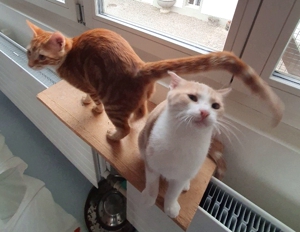 Karenji und ich sind die beiden eher ruhigeren. Wir geben uns aber Mühe, dass das Zimmer am Morgen weiterhin ziemlich unordentlich aussieht 😂. Am letzten Tag, als wir noch zu 4. waren, haben wir es geschafft, den Korb auf dem Kratzbaum abzuräumen… 😉 jetzt liegt er am Boden. Wir waren zu 4. doch zu schwer… ich wiege nämlich schon 3,2 kg, und Karenji nur 2,4 kg. Das wissen wir, weil wir beim Tierarzt waren vor Weihnachten… wir haben endlich unsere erste Impfung bekommen.