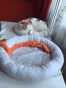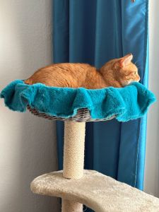 Für die beiden Körbe auf dem Kratzbaum gab es schöne neue Kuscheldecken, natürlich in blau, denn farblich muss bei unserer Angestellten immer alles zueinander passen. Mir ist es zwar wichtiger, dass mein Kinn beim Ablegen auf dem Korbrand weich liegt, aber ich muss zugeben, dass Matos rotbraunes Fell auf dem türkisblauen Polster hervorragend zur Geltung kommt ❤️.
