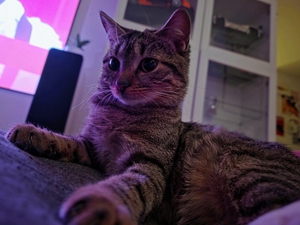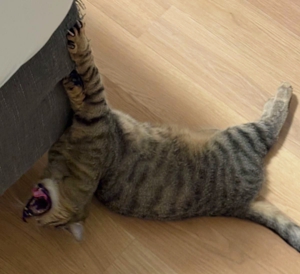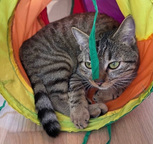 Momentan lieben alle drei ihren Spieltunnel wieder. Der Tunnel ist allerdings nicht gross genug, damit alle drei gleichzeitig darin schlafen können. Also wird schwesterlich geteilt und jede darf mal. Es ist fast rührend, wie fair das läuft. Fast 😉. Sayuri hat ausserdem einen elektrischen Fisch als neues Lieblingsspielzeug entdeckt und trägt ihn gerne stolz durch die Wohnung, als hätte sie gerade selbst erfolgreich gejagt.