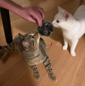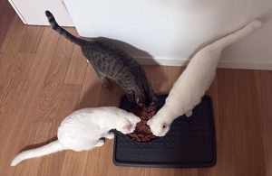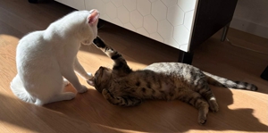 Untereinander verstehen sie sich weiterhin super: Sie fressen gemeinsam aus derselben Schüssel, spielen miteinander, null Futterneid, null Drama beim Streicheln 🥰. Im Gegenteil: Es ist sogar richtig schön zu sehen, wie sie sich gegenseitig zum Spielen und Herumflitzen animieren. Ausser natürlich auf unsere Hände fürs Leckerli-Geben und fürs Kraulen.