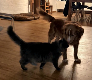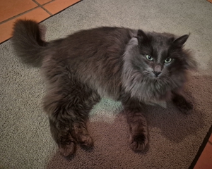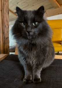 Mit den Hunden versteht er sich gut, und auch draussen hat er sich mit den anderen Katzen arrangiert. Er liebt es sehr, draussen zu sein. Besonders gerne jagt er und bringt immer mal wieder seine Trophäen 🤭 mit nach Hause. Samsi ist äusserst pflegeleicht und hält sich auch bei Regen oder Schnee gerne draussen auf. Dank der Katzenklappe kann er selbständig entscheiden, wann er hinaus möchte oder lieber drinnen ein Nickerchen macht. Er liebt es auch sehr, gebürstet zu werden — was bei seinem langen Fell natürlich sehr praktisch ist 😃.