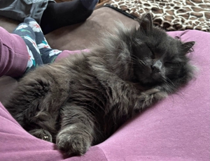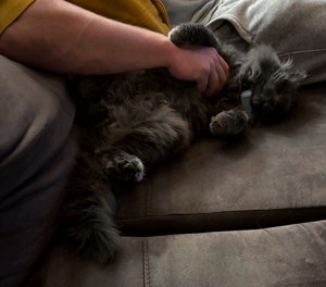 Mit den Hunden versteht er sich gut, und auch draussen hat er sich mit den anderen Katzen arrangiert. Er liebt es sehr, draussen zu sein. Besonders gerne jagt er und bringt immer mal wieder seine Trophäen 🤭 mit nach Hause. Samsi ist äusserst pflegeleicht und hält sich auch bei Regen oder Schnee gerne draussen auf. Dank der Katzenklappe kann er selbständig entscheiden, wann er hinaus möchte oder lieber drinnen ein Nickerchen macht. Er liebt es auch sehr, gebürstet zu werden — was bei seinem langen Fell natürlich sehr praktisch ist 😃.