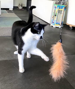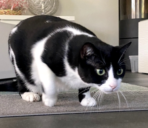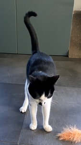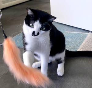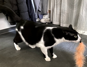 Bei meinem Eintritt ins Haus sah ich ihn gleich, den kräftigen Kater Bob. Sein Blick war äusserts skeptisch 😳. Wäre die Kellertüre offen gewesen, hätte ich wohl nicht mehr viel von ihm gesehen. Aber er blieb, legte zwar seine Ohren nach hinten, aber er blieb. Langsam zog ich meinen Raschelsack hervor und zückte die Spielangel, es wirkte Wunder 😃. Die Neugierde siegte. So hatte ich das Glück, dass ich Bob die ganze Zeitdauer meines Aufenthalts bewundern durfte.