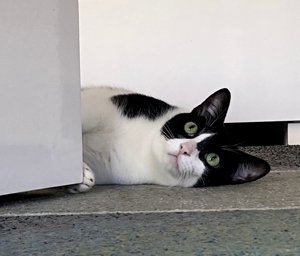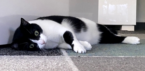 Bob hingegen hat seine Scheu, die er anfangs enorm hatte, immer noch nicht ganz abgelegt. Nur die Mama und die ältere Tochter können Bob so richtig gut streicheln, der Rest der Familie kann dies nur, wenn er super relaxt ist, dann dürfen auch sie sein Fell berühren. Bob achtet immer schön auf seine zwei Meter Sicherheitsabstand. Nur ab und zu vergisst er ihn, so hat er auch bei mir, als wir zusammenspielten, plötzlich bemerkt, dass er ja viel zu nahe ist 🙀 und hat schnell seinen Sicherheitsabstand wahrgenommen. Will man Bob einfach so streicheln, kann es schon sein, dass er einem die Tatze zeigt, ungefragt lässt er sich nicht anfassen. Wird jedoch Baggi von der Menschen-Mama gestreichelt, wird Bob eifersüchtig und zwängt sich dazwischen, Baggi verzieht sich dann, er hat ja genug andere Hände, die ihn streicheln können 😊. Bob mag seine Menschen-Mama sehr und er begleitet sie fast immer, er liebt es vor allem im Keller und hilft gerne bei der Wäsche. In der Anfangszeit war Bob meist irgendwo versteckt, doch dies gehört der Vergangenheit an. Bob fühlt sich sehr wohl in seinem Zuhause. Wenn der Balkon offensteht, geht er zwar gerne mal kurz raus, schaut einmal umher, dann geht er auch bald wieder rein, das reicht für ihn vollkommen. Er ist eher der gemütliche Kater und geniesst es zu relaxen.