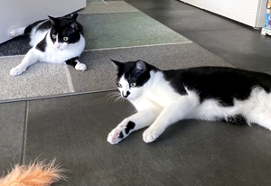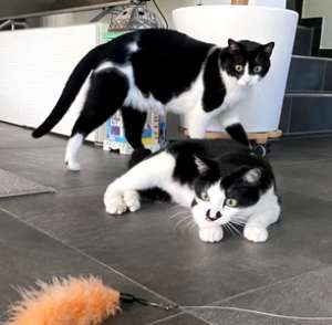 Beide Katzen mögen den Staubsauger gar nicht, vor anderen Maschinen haben sie aber keine Angst. Das Ausbuddeln der grossen Zimmerpflanze hat auch langsam seinen Reiz verloren und das Sofa wurde von ihren Krallen verschont, anders das Bett, aber die Besitzer stört das nicht, schliesslich sind es ja Katzen 🤭. Die zwei Samtpfoten begrüssen ihre Menschen immer, wenn sie nach Hause kommen und die Mama wird auch aufs Klo eskortiert. Für ihr “Schlecki” machen die beiden auch schön Sitz. Die zwei Kater verstehen sich prächtig, sie putzen sich gegenseitig und manchmal kuscheln sie zusammen im kleinsten Körbchen 🥰, das es gibt. Obwohl die zwei keinen Freigang haben, mangelt es ihnen an nichts, im ganzen Haus dürfen sie sich bewegen und ihre Menschen sind viel zuhause, was will man mehr!