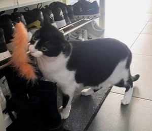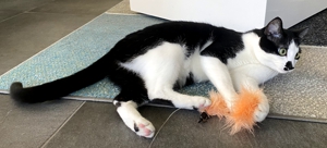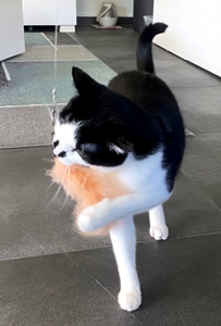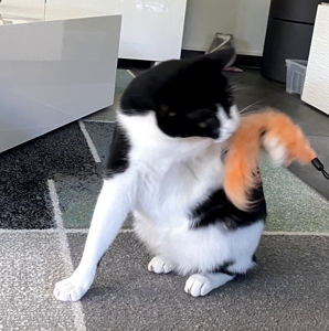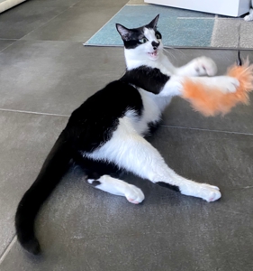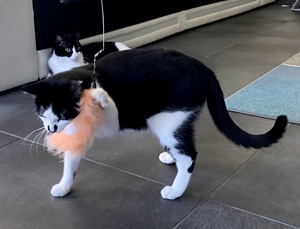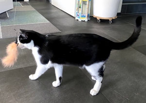 Bei meinem Eintritt ins Haus sah ich ihn gleich, den kräftigen Kater Bob. Sein Blick war äusserts skeptisch 😳. Wäre die Kellertüre offen gewesen, hätte ich wohl nicht mehr viel von ihm gesehen. Aber er blieb, legte zwar seine Ohren nach hinten, aber er blieb. Langsam zog ich meinen Raschelsack hervor und zückte die Spielangel, es wirkte Wunder 😃. Die Neugierde siegte. So hatte ich das Glück, dass ich Bob die ganze Zeitdauer meines Aufenthalts bewundern durfte.