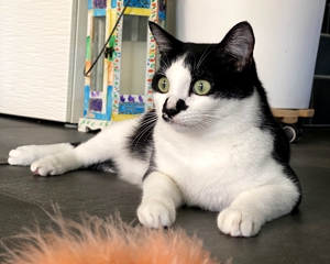 Bob hingegen hat seine Scheu, die er anfangs enorm hatte, immer noch nicht ganz abgelegt. Nur die Mama und die ältere Tochter können Bob so richtig gut streicheln, der Rest der Familie kann dies nur, wenn er super relaxt ist, dann dürfen auch sie sein Fell berühren. Bob achtet immer schön auf seine zwei Meter Sicherheitsabstand. Nur ab und zu vergisst er ihn, so hat er auch bei mir, als wir zusammenspielten, plötzlich bemerkt, dass er ja viel zu nahe ist 🙀 und hat schnell seinen Sicherheitsabstand wahrgenommen. Will man Bob einfach so streicheln, kann es schon sein, dass er einem die Tatze zeigt, ungefragt lässt er sich nicht anfassen. Wird jedoch Baggi von der Menschen-Mama gestreichelt, wird Bob eifersüchtig und zwängt sich dazwischen, Baggi verzieht sich dann, er hat ja genug andere Hände, die ihn streicheln können 😊. Bob mag seine Menschen-Mama sehr und er begleitet sie fast immer, er liebt es vor allem im Keller und hilft gerne bei der Wäsche. In der Anfangszeit war Bob meist irgendwo versteckt, doch dies gehört der Vergangenheit an. Bob fühlt sich sehr wohl in seinem Zuhause. Wenn der Balkon offensteht, geht er zwar gerne mal kurz raus, schaut einmal umher, dann geht er auch bald wieder rein, das reicht für ihn vollkommen. Er ist eher der gemütliche Kater und geniesst es zu relaxen.