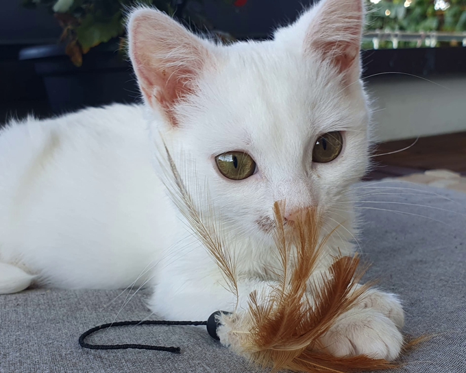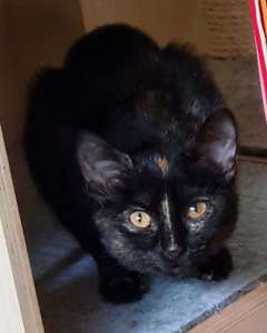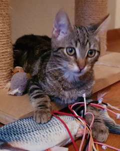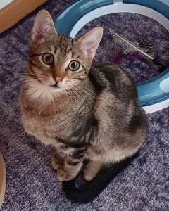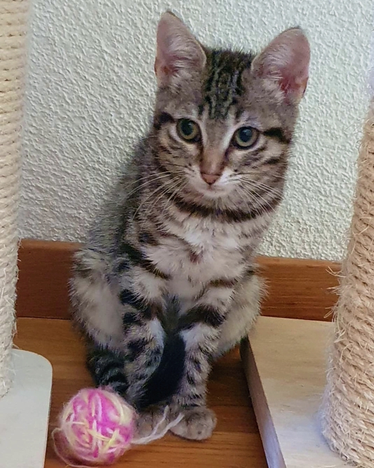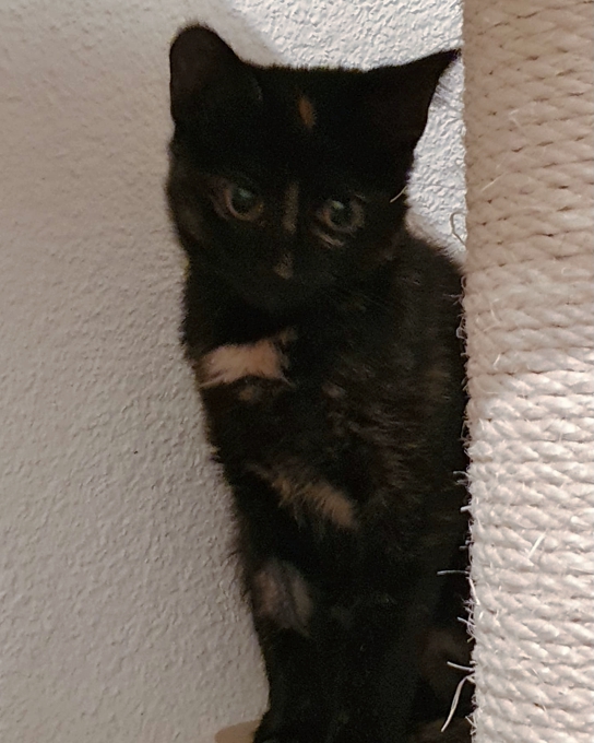 Kaju ist die Kleinste der Bande. Sie orientiert sich stark an Indira und spielt auch sehr viel mit ihr. Ihre Spieltrophäen versenkt sie gerne im Katzenklo oder dem Wassernapf. Kaju ist noch skeptisch dem Menschen gegenüber, aber auch neugierig und kommt auch gerne zum Spielen aus ihrem sicheren Nest. Auch Kaju ist noch kein Schmusebüsi und braucht ein Zuhause mit Menschen, die viel Zeit und Geduld haben, um ihr zu zeigen, dass es sich lohnt, den Menschen zu vertrauen. Sie versteht sich gut mit Indira.